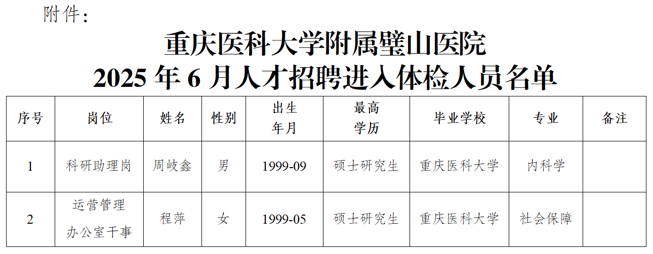 根據(jù)“重慶醫(yī)科大學附屬璧山醫(yī)院人才招聘通知”有關規(guī)定和程序,現(xiàn)將進入體檢人員名單予以公示,體檢時間及注意事項另行通知。