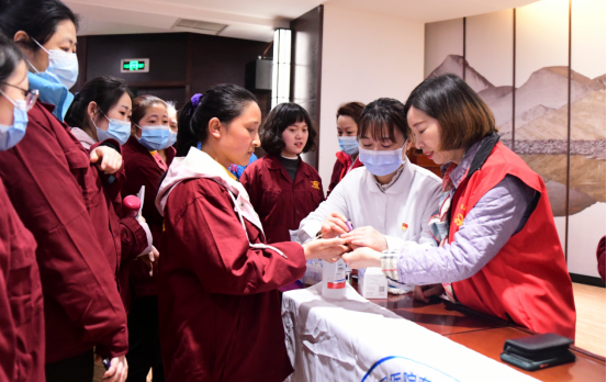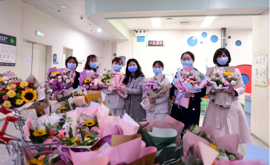 工作人員為奮斗在一線崗位上的女神們送上節日鮮花。