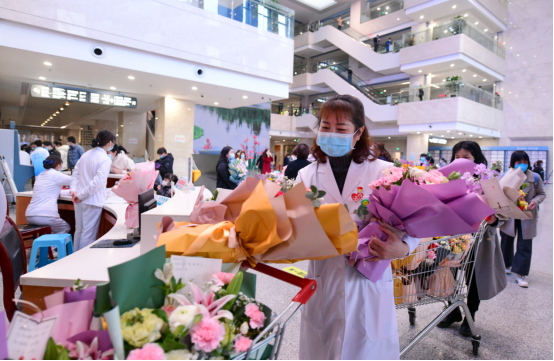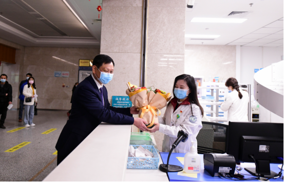 黨委副書記、院長朱堂棋為門診藥房工作人員送去鮮花。