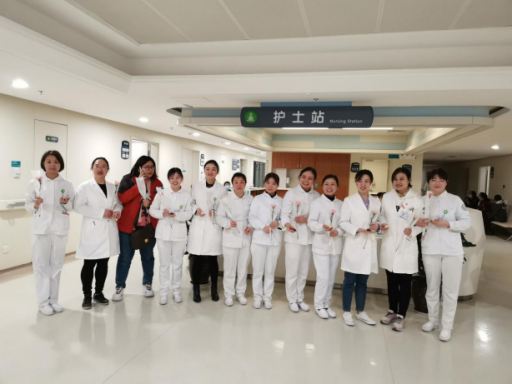黨委書記劉鴻(右一)為咨詢臺護士送上鮮花及節日祝福。