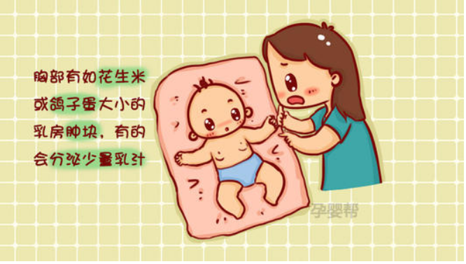 剛出生的新生兒,由于受到母體激素的影響,生后1周左右部分寶寶可能出現乳腺增大,如蠶豆大小,甚至出現乳暈及泌乳情況,2-3周可消退,不可擠壓,以防感染。