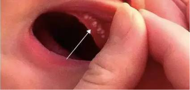 新生兒牙齦上出現的黃白色小顆粒,稱為馬牙,硬腭中線上大小不等的黃色小結節,稱為彭氏珠,都是由于上皮細胞堆積形成,可自行消退,切勿挑破,以防感染。兩側頰部各有一個隆起的脂肪墊,稱為“螳螂嘴”,有利于吸吮乳汁,不可挑破。