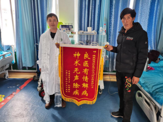 (患兒家屬為重慶市璧山區人民醫院援藏醫生韓周玻送上錦旗,并為他獻上潔白的哈達)