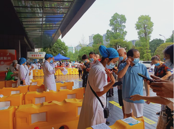 8月初,江津雙福地區出現確診病例,新冠核酸檢測需求量激增,醫院迅速反應重啟“愿檢盡檢核酸采集點”,在院外安置核酸采集屋,運行集掛號、繳費、核酸采集、報告打印一體的模式,為患者節約時間精力的同時降到疫情傳播的風險,志愿者沖鋒在前,承擔著分流中高風險返渝人員,維持排隊秩序保持人群一米間距,指導患者自助機或移動端掛號繳費等任務。疫情當前,他們從不畏懼,做好自身防護的同時耐心地向患者講解。