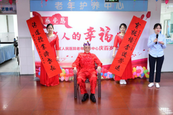 “一年有365個(gè)日出,我送你365個(gè)祝福……”在重慶市璧山區(qū)人民醫(yī)院老年護(hù)養(yǎng)中心傳來了歡快嘹亮的歌聲,這是一位百歲老人的生日現(xiàn)場。院黨委書記劉鴻、副院長郭進(jìn)軍(主持行政工作)、副院長彭彩碧攜護(hù)養(yǎng)中心的“醫(yī)護(hù)兒女”為冉茂常爺爺送上了蛋糕、鮮花與祝福,并齊唱起了《365個(gè)祝福》。