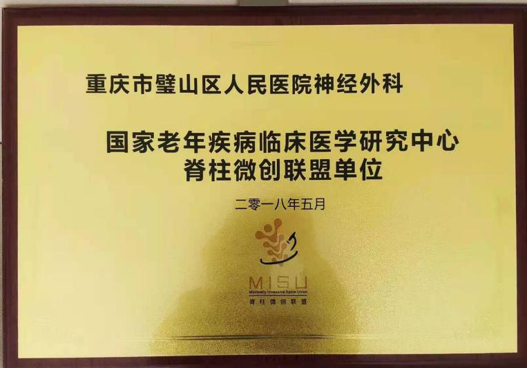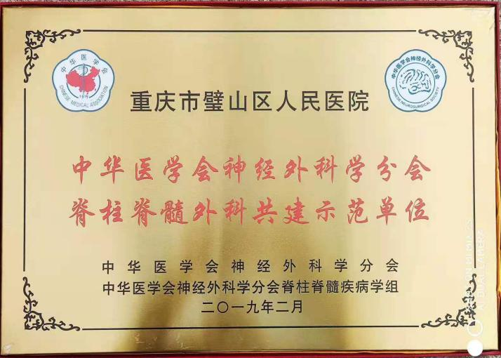 重慶醫科大學附屬璧山醫院(重慶市璧山區人民醫院)神經外科脊柱脊髓專業組,目前是中華醫學會神經外科分會脊柱脊髓外科共建示范單位,國家老年疾病臨床醫學研究中心脊柱脊髓微創聯盟單位,重慶市醫學會神經外科分會脊柱脊髓學組副組長單位。常年開展各種頸椎病,腰椎病,脊柱脊髓外傷,脊柱脊髓腫瘤以及顱頸畸形的微創手術治療。率先在區縣級醫院開展上頸椎手術,擅長各類頸椎間盤及腰椎間盤突出微創手術,并處于領先地位。