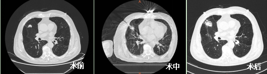 為進一步進行治療,王開金副主任帶領胡學進副主任醫師、陳進主治醫師等呼吸介入團隊聯合麻醉科王艷冰副主任進行了縝密的術前討論,綜合評估患者的整體狀況,術前討論決定為患者右肺上葉高危結節進行微波消融術。做好充分術前準備后,團隊于6月16日CT引導下行右肺上葉結節微波消融術,術程順利,全程無痛,術后無并發癥出現。現患者愈后良好,于術后第三天辦理出院,并擬1月后對右肺中葉結節行氬氦刀冷凍消融術。