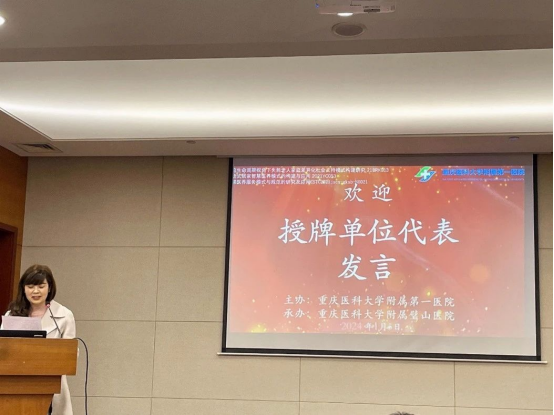 授牌儀式在激情洋溢的音樂中進(jìn)行,我院郭進(jìn)軍院長(zhǎng)及謝莉玲教授向附一院青杠護(hù)養(yǎng)中心、我院科教部、璧泉街道衛(wèi)生服務(wù)中心護(hù)理部等3家基地授牌。我院科教部陳梅主任代表研學(xué)基地接牌,并代表研學(xué)基地發(fā)言,她首先表達(dá)了在新年伊始收到一份“沉甸甸”禮物的激動(dòng)喜悅之情,向趙慶華教授團(tuán)隊(duì)對(duì)我院的厚愛與信任表達(dá)了衷心感謝,并表示此次研學(xué)基地授牌儀式,將進(jìn)一步促進(jìn)重醫(yī)附一院對(duì)我院在護(hù)理科研領(lǐng)域的指導(dǎo)與合作,同時(shí)將努力把研學(xué)基地建成培養(yǎng)未來護(hù)理專業(yè)人才的重要搖籃。