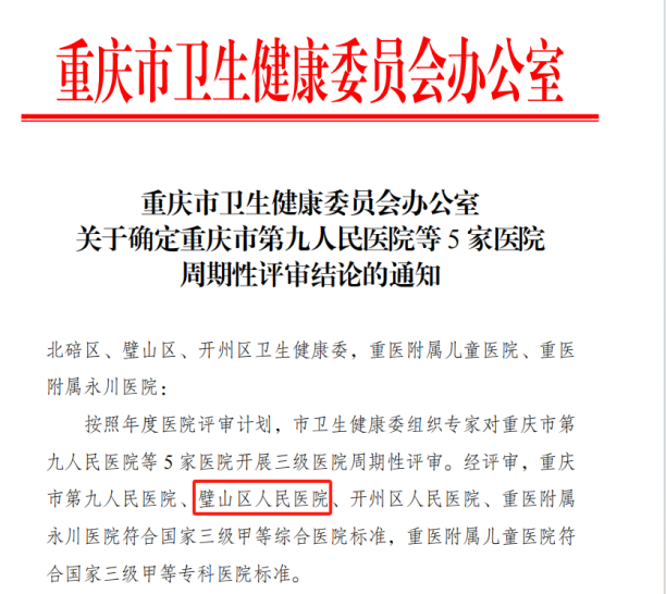 日前,重慶市衛健委正式發文,確定了重慶醫科大學附屬璧山醫院(重慶市璧山區人民醫院)順利通過三級甲等醫院復審!標志著醫院醫療技術、服務水平、綜合能力實現新的跨越,醫院發展再次躍上新臺階。