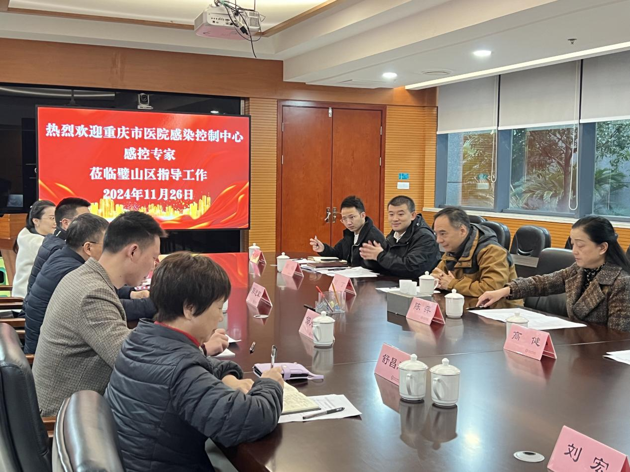 11月26日,重慶市醫院感染控制中心主任劉丁、副主任陳萍蒞臨重慶醫科大學附屬璧山醫院(重慶市璧山區人民醫院),對區域質控中心的感控工作進行了深入調研,并提供專業指導。璧山區衛生健康委副主任周鳴、醫政醫管科副科長李承洋,重醫附屬璧山醫院院長郭進軍、副院長單雪峰以及璧山區第二人民醫院副院長鄒凡華出席活動。同時,區醫院感染質控中心專家組全體成員也參與其中。此次調研工作會全程由重醫附屬璧山醫院副院長單雪峰主持。