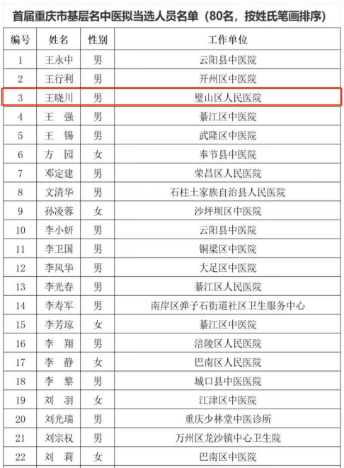 為進一步鞏固我市基層中醫藥人才隊伍,選拔一批醫德高尚、醫術精湛、扎根基層的名中醫,助力全市中醫藥事業高質量發展,重慶市衛生健康委和重慶市中醫管理局開展了首屆重慶市基層名中醫評選工作。