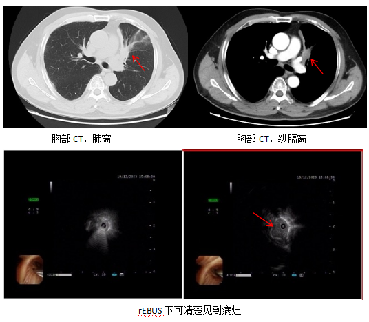患者男,68歲,因“發(fā)現(xiàn)左肺上葉結(jié)節(jié)影1天”至我院就診,門(mén)診查胸部CT提示:左肺上葉前段縱隔旁片狀實(shí)變影,性質(zhì)待定,腫瘤性病變不除外,遂收治我院胸心血管外科。氣管鏡未能窺覬病變,考慮患者病灶位于肺門(mén)處且毗鄰大血管,經(jīng)皮肺穿刺活檢風(fēng)險(xiǎn)較大。故呼吸與危重癥醫(yī)學(xué)科為患者行rEBUS-TBLB檢查:在超聲支氣管鏡下精準(zhǔn)定位病灶,于新生物處行活檢,最后病理結(jié)果為“鱗狀細(xì)胞癌”。經(jīng)全身評(píng)估后,患者早期肺癌診斷明確,于我院胸心血管外科在全麻下行胸腔鏡下左肺上葉切除+縱隔淋巴結(jié)清掃術(shù),術(shù)中順利,術(shù)后恢復(fù)良好,患者病情穩(wěn)定后出院。