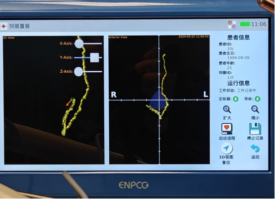 三維定向電磁導航系統運用先進的弱磁傳感技術,能夠在鼻空腸管置入過程中精確顯示其在患者體內運行軌跡,幫助護士提前預判導管前進方向,并進行精準定位。與傳統盲插法相比,該項技術不僅攻克了置管難、置管時間長等問題,也有效降低患者發生胃腸黏膜損傷、窒息等的風險,減輕患者不適與痛苦。