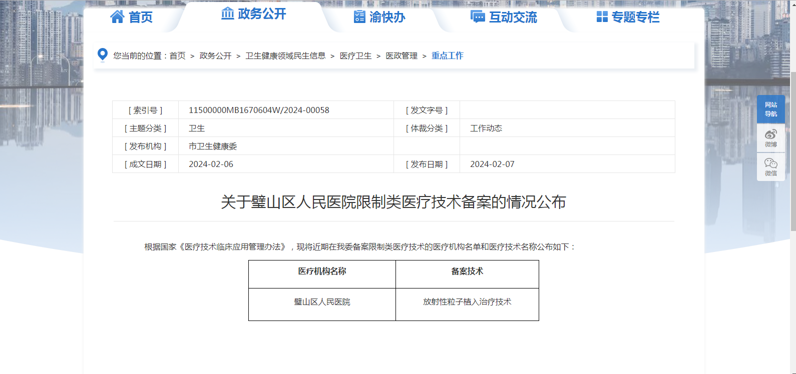 近日,從市衛生健康委官方網站《限制類醫療技術備案的情況公布》中獲悉,經過嚴格的審查和評估,我院呼吸與危重癥醫學科成功獲得放射性粒子植入治療技術的資質認證。這一技術的獲批,標志著我院呼吸與危重癥醫學科在肺癌治療領域取得了新的突破,將為廣大肺癌患者帶來更加精準、有效的治療手段。