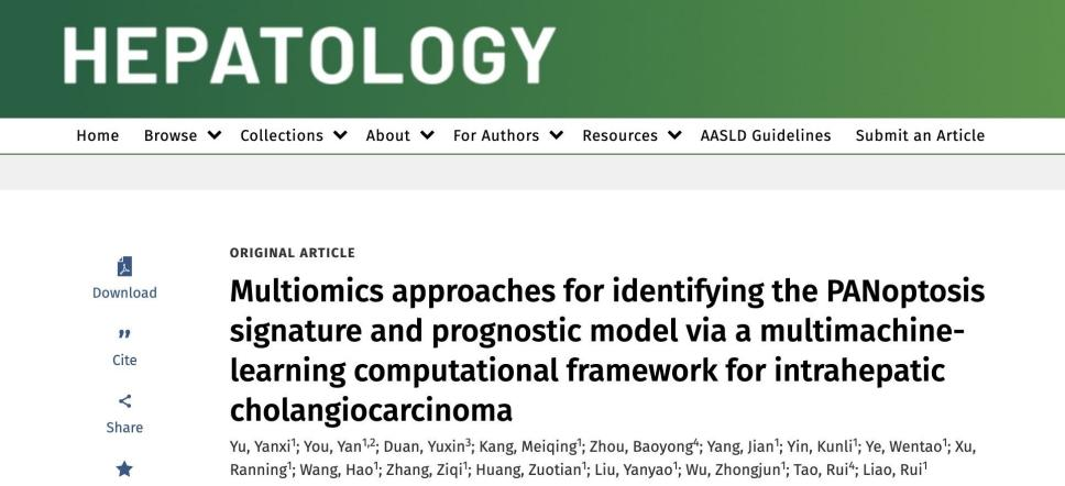 近日,重慶醫科大學附屬璧山醫院陶銳教授團隊聯合重慶醫科大學附屬第一醫院肝膽外科廖銳主任醫師團隊在國際肝臟病學頂級期刊,美國肝病學協會會刊《HEPATOLOGY》(JCR及中信所Q1,IF:12.9)在線發表題為“Multiomics approaches for identifying the PANoptosis signature and prognostic model via a multimachine-learning computational framework for intrahepatic cholangiocarcinoma”的研究論文。該研究首次將程序性細胞死亡新形式“泛凋亡(PANoptosis)”引入肝內膽管癌(ICC)研究,通過多組學整合+多模型機器學習的策略,構建了一套可用于預后預測及治療指導的“PANoptosis風險評分模型(PANRS)”,并揭示了CAF-POSTN-TAMs軸作為ICB免疫治療耐藥潛在機制的新證據。