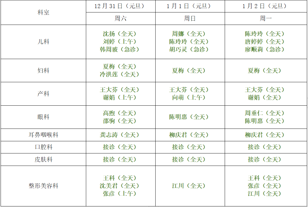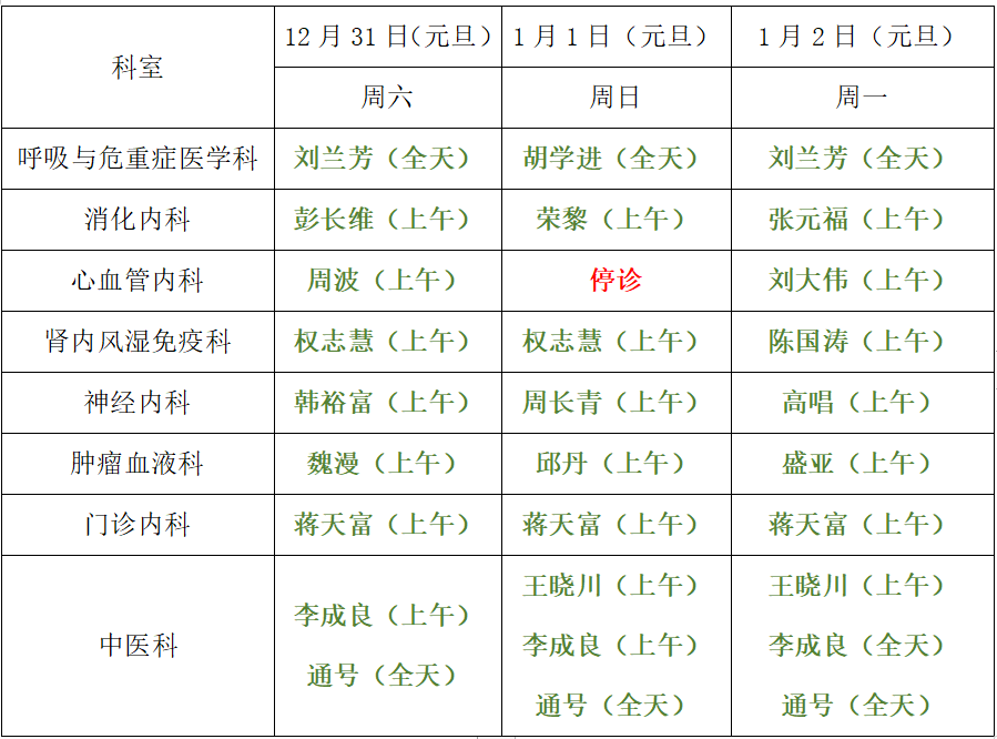 元旦期間,重慶市璧山區人民醫院所有門診按節假日門診進行,出診時間為上午8:00-12:00,下午14:30-17:30;具體出診安排如下: