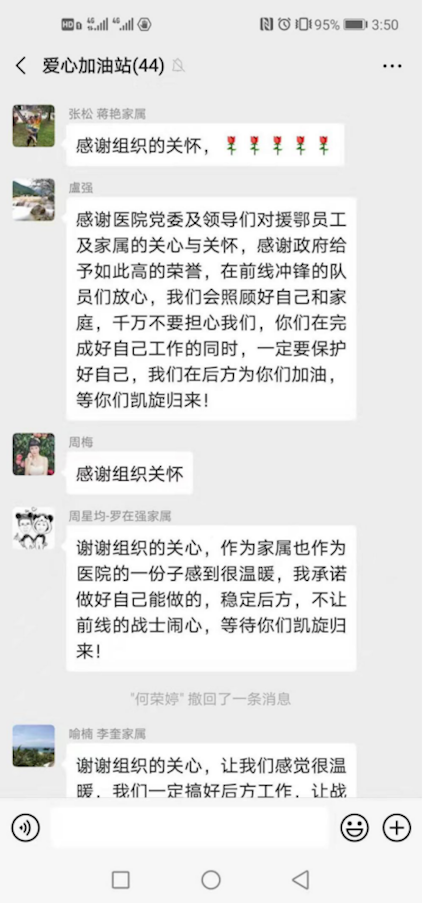 “感謝院黨委及領導們對援鄂員工和家屬們的關心關懷!”“有什么需要盡管開口,我們會盡心為你們服好務!”“我們一定不辱使命,凱旋歸來!”……在“愛心加油站”微信群里,這樣正能量的話語層出不窮。該微信群邀請了援鄂隊員及家庭代表,通過建立起院領導“一對一”聯系組,每天發送問候信息、鼓勵信息,推送有關援鄂隊員在前線的工作、生活信息……