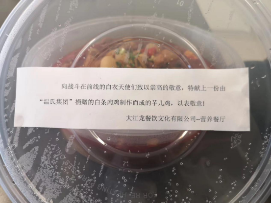 “向戰斗在前線的白衣天使們致以崇高的敬意!特獻上一份特制芋兒雞,以表敬意!”這段時間,奮戰在一線的醫務人員總是發現,從食堂送來的盒飯中,經常會多出來幾道菜。