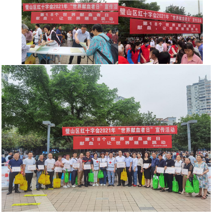 在璧山區衛健委的大力支持下,活動于6月8日由璧山區人民醫院、璧山區中心血庫與璧山區紅十字會在璧山區大成廣場聯合舉辦。因疫情防控需要,隨機抽取了2018-2019年獲國家表彰的無償獻血者常川黔(金獎)、尹國森(金獎)、鄧英(銀獎)、胡玉群(銀獎)等20名代表到達現場參與活動,并舉行了頒獎儀式。